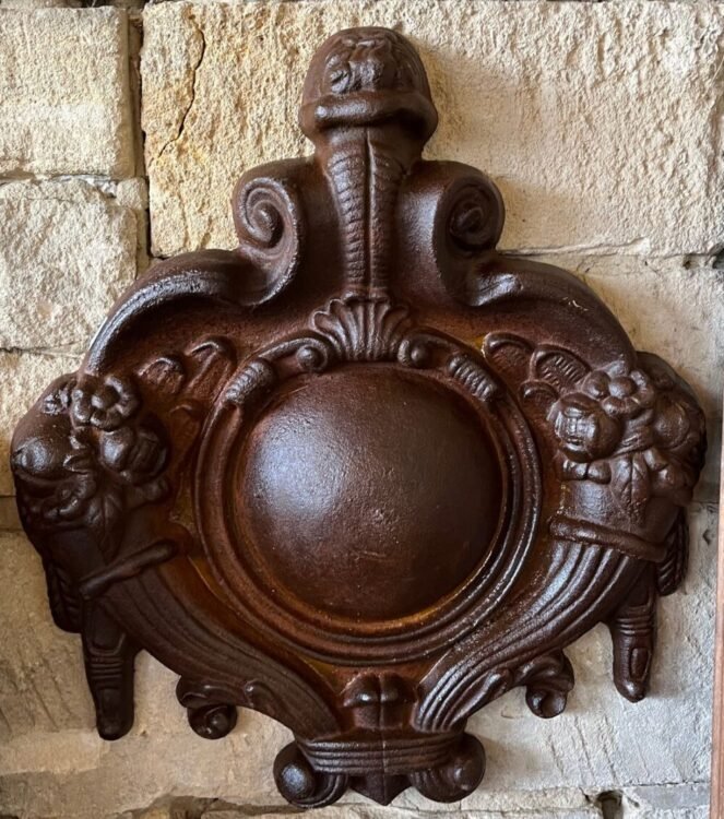 • Description courte: Plaque en fonte aspect vieilli, façon calicot ancien que l’on retrouvait à l’entrée des écuries ou des porches des relais de poste. Traitée par un vernis anti-rouille. Couleur brune. Attache derrière pour accroche murale.