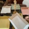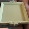 • Il est de couleur vert amande légèrement veiné de beige. Motif sculpté sur les poignées Ses dimensions sont:  29×26 cm. Le verso est noir.