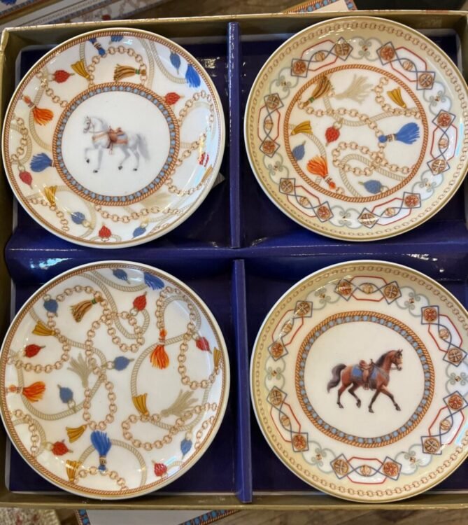 • Description courte: 4 petites « coupes » 1 décor cheval gris , 1 décor cheval bai, 2 décors détails de boucles, sangles chaînes et pampilles . Fond blanc, couleurs dorée, bleue et orangée. Porcelaine compatible lave-vaisselle et micro-ondes.