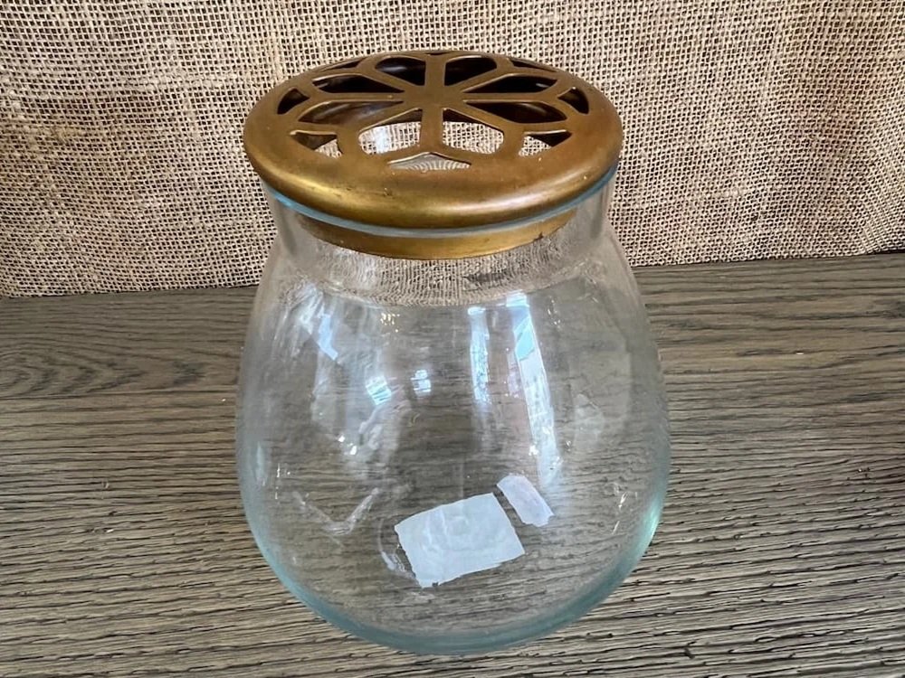 • Petit vase en verre avec couvercle en métal ajouré décor fleur, permettant aux tiges des fleurs de « tenir » pour la création de bouquets.