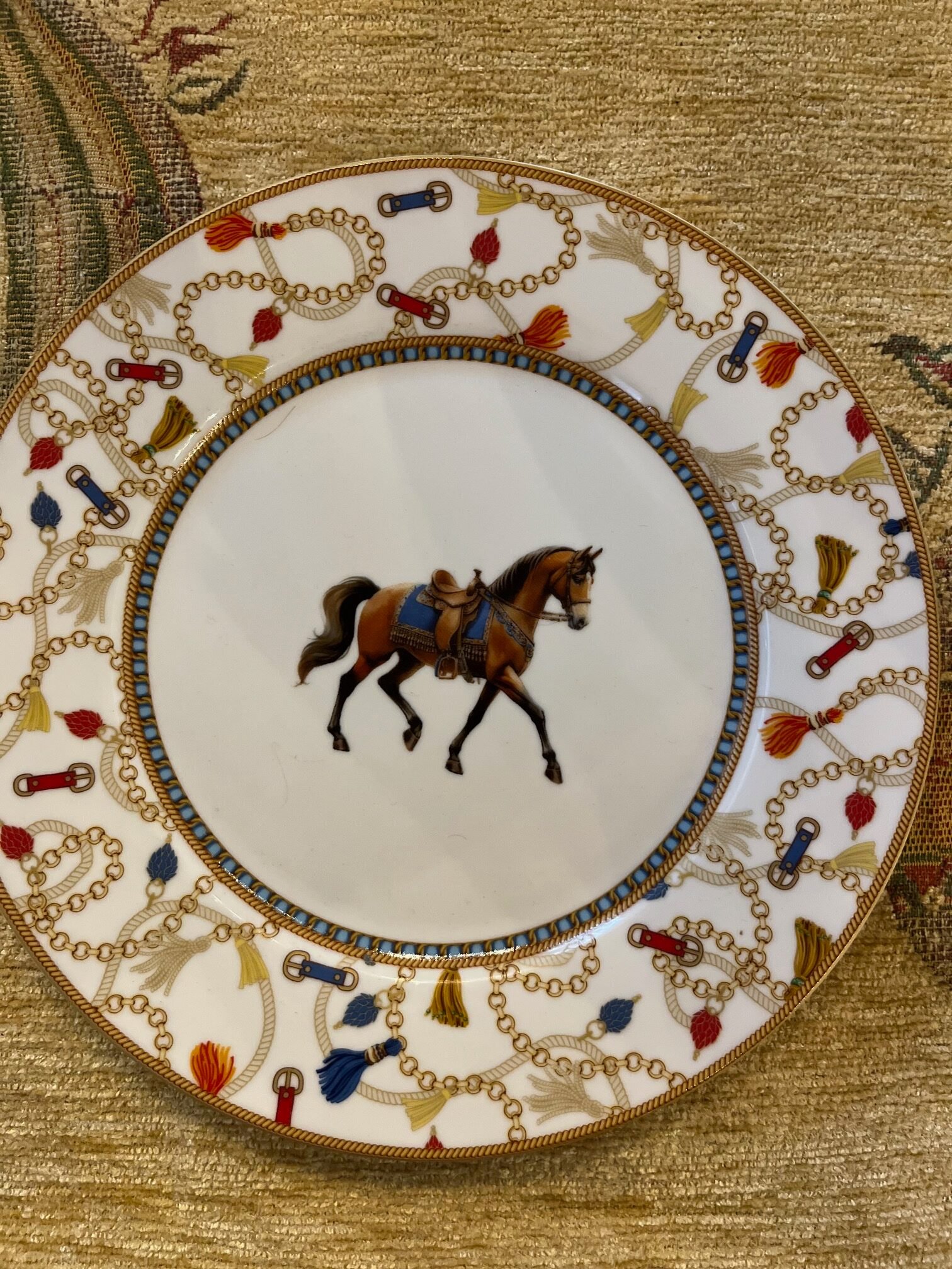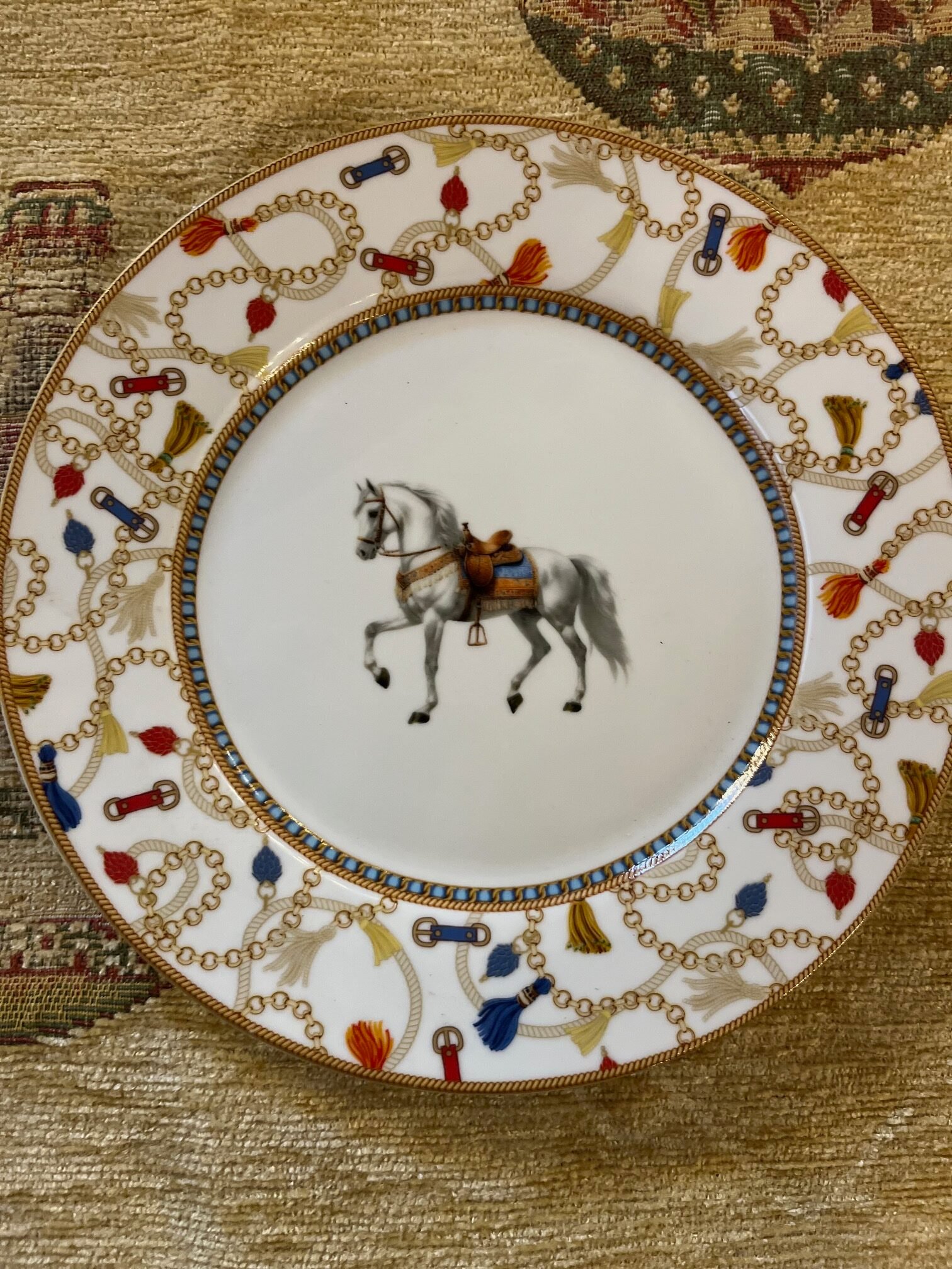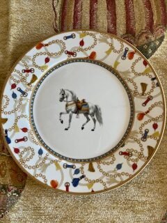 Description courte: Assiette à dessert soit avec 1 décor cheval gris , soit avec 1 décor cheval bai, détails de boucles, sangles chaînes et pampilles . Fond blanc, couleurs dorée, bleue et orangée. Porcelaine compatible lave-vaisselle et micro-ondes.
