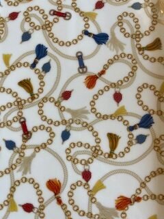 Description courte: Plat à cake décor détails de boucles, sangles chaînes et pampilles. Fond blanc, couleurs dorée, bleue et orangée. Porcelaine compatible lave-vaisselle et micro-ondes.